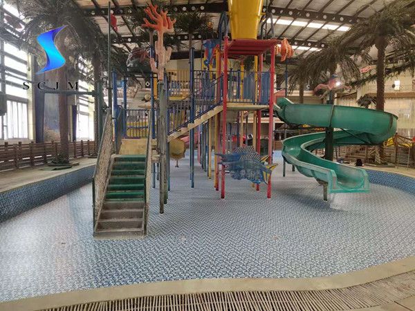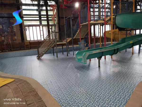 本項目位于北京市,為室內水上樂園項目,原基礎為馬賽克瓷磚,局部有脫落、開裂問題,采用1.5mm泳池膠膜施工安裝,采用滿刮膠工藝熱熔焊接。施工安裝之前瓷磚損壞部分做找平處理,泳池膠膜施工安裝完畢后,整體比較平整、美觀?,F場效果如下: